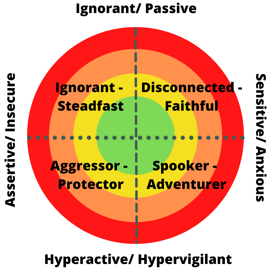 Regarding the default confidence spectrum, we can have horses range from confident in their own body while insecure in their environment or interactions, to horses that are sensitive and lack confidence in their self, their environment and interactions. Then with our responsiveness level, they can default to either passive and ignorant, to hypervigilent and hyperactive.